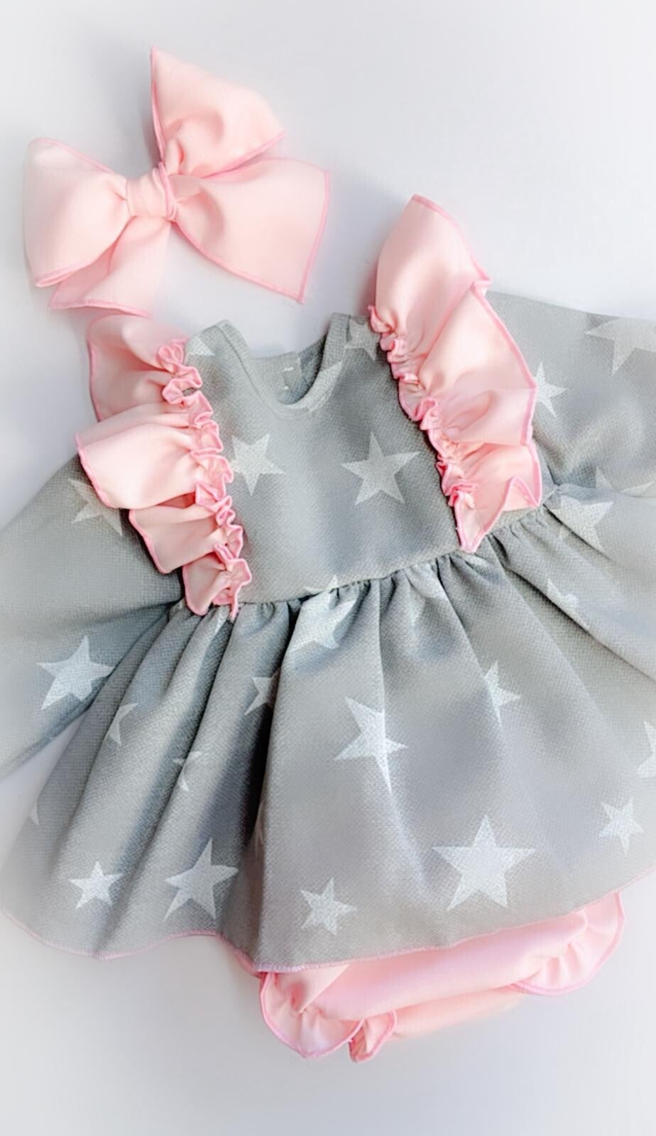 Este precioso jesusito de manga larga combina la elegancia del gris con un delicado estampado de estrellas blancas y encantadores volantes rosa pastel.